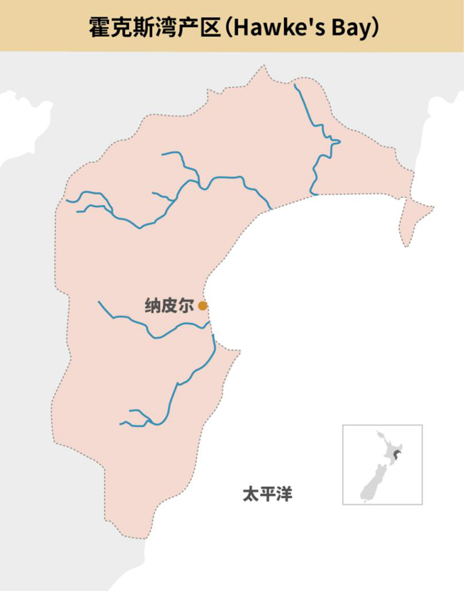 霍克斯灣的大部分葡萄園都受到太平洋的影響,其中緊鄰海洋的葡萄種植區(qū)受其影響最大,氣候更為溫和,葡萄生長季愈加漫長。位于北部的埃斯克河谷(Esk River Valley)和南部的特阿萬加(Te Awanga)的土壤類型主要為礫石,霞多麗(Chardonnay)和黑皮諾(Pinot Noir)在此表現(xiàn)優(yōu)秀。