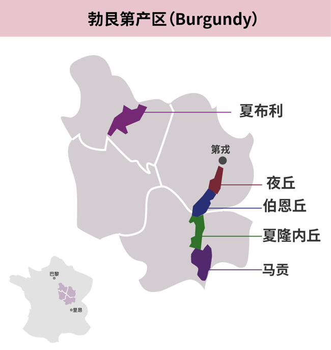 高品質的霞多麗分布于夏布利、伯恩丘和馬貢等產區,由于霞多麗的適應性強,依據產區不同,霞多麗的風格十分多變。北部夏布利氣候涼爽,出產的霞多麗酒體清瘦,酸度較高。中部伯恩丘氣候溫和,匯集著夏山-蒙哈榭(Chassagne-Montrachet)、普里尼-蒙哈榭(Puligny-Montrachet)和默爾索(Meursault)等重量級優質村莊級產區,出產的霞多麗以酒體復雜飽滿和極具表現力而著稱。南部馬貢氣候溫暖,其知名度最高的子產區——普伊-富賽(Pouilly-Fuisse)出產的霞多麗香氣多樣,酒體更為飽滿,常常表現出明顯的橡木特征。