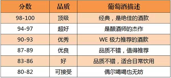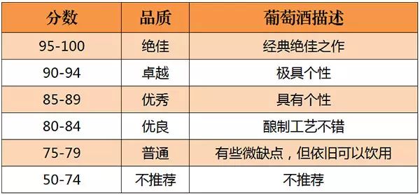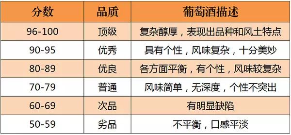 美國的《葡萄酒與烈酒》(Wine & Spirits)雜志是世界上最權(quán)威的葡萄酒雜志之一。自 1994年起,《葡萄酒與烈酒》也開始采取百分制對葡萄酒進行評分,葡萄酒首先會經(jīng)過一些葡萄酒專業(yè)人士進行初次品嘗篩選,之后才會送到專業(yè)“評酒團”品評,所以該雜志評分的葡萄酒品質(zhì)都不錯。評分標準如下所示:
