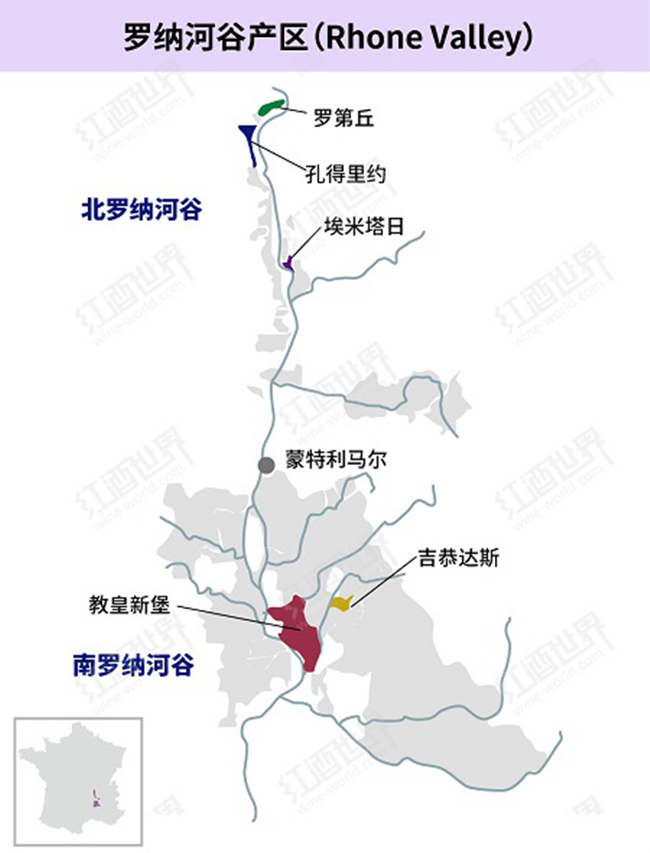 羅納河谷位于法國(guó)南部,整體沿著羅納河(Rhone River)由北向南呈條狀分布。這里歷史悠久,一直是法國(guó)備受追捧的葡萄酒產(chǎn)區(qū)。因南北區(qū)域的自然環(huán)境差異較大,羅納河谷產(chǎn)區(qū)一般被分成兩個(gè)部分,其中瓦朗斯鎮(zhèn)(Valence)以北為北羅納河谷(North Rhone),蒙特利馬爾鎮(zhèn)(Montelimar)以南為南羅納河谷(South Rhone)。北羅納屬于溫和的大陸性氣候,葡萄園多位于陡峭的山坡上,這里主要生產(chǎn)西拉(Syrah)紅葡萄酒,但也會(huì)釀造少量維歐尼(Viognier)、瑚珊(Roussanne)和瑪珊(Marsanne)白葡萄酒。南羅納則屬于地中海氣候,這里炎熱干燥且風(fēng)力強(qiáng)勁,葡萄園的地形更為平坦。南羅納擁有比北羅納更加豐富的葡萄品種,包括西拉、歌海娜(Grenache)、慕合懷特(Mourvedre)和白歌海娜(Grenache Blanc)等。其中,最為重要的是歌海娜,其常與西拉、慕合懷特和神索(Cinsault)等品種一同混釀。