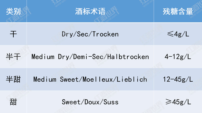 人們根據(jù)殘?zhí)呛繉⑵咸丫品譃榱税ǜ尚驮趦?nèi)的幾個類別,具體可參照下表。需要注意的是,“干型”葡萄酒并不是完全不含糖,只是含糖量較低,無法被人所感知而已。