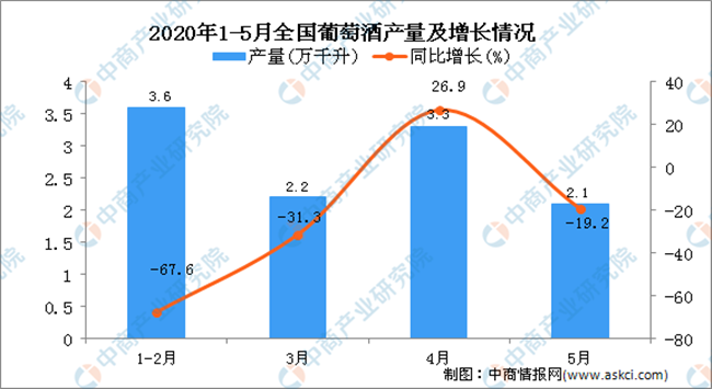 據(jù)中商產(chǎn)業(yè)研究院數(shù)據(jù)庫顯示,2020年5月全國葡萄酒產(chǎn)量下降,2020年5月全國葡萄酒產(chǎn)量為2.1萬千升,同比下降19.2%。2020年1-5月全國葡萄酒產(chǎn)量為10.2萬千升,同比下降32%。