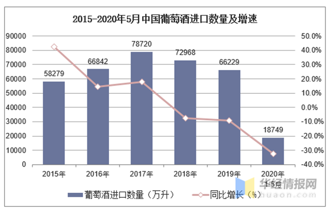 2015-2020年5月中國葡萄酒進口數量及增速