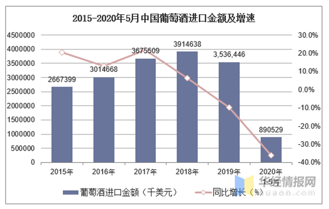 2015-2020年5月中國葡萄酒進口金額及增速