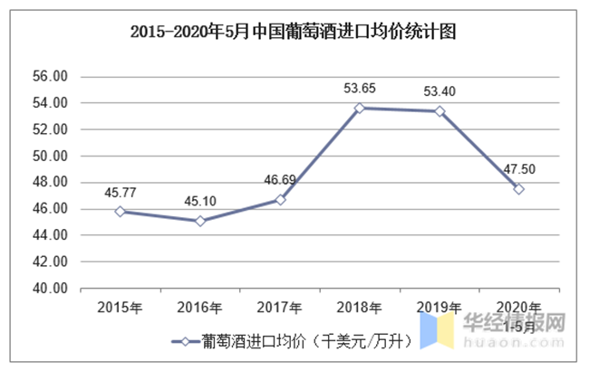 2015-2020年5月中國葡萄酒進口均價統計圖