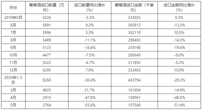 2020年5月中國葡萄酒進口數量為2764萬升,同比下降55.6%;進口金額為157540千美元,同比下降51.4%。
