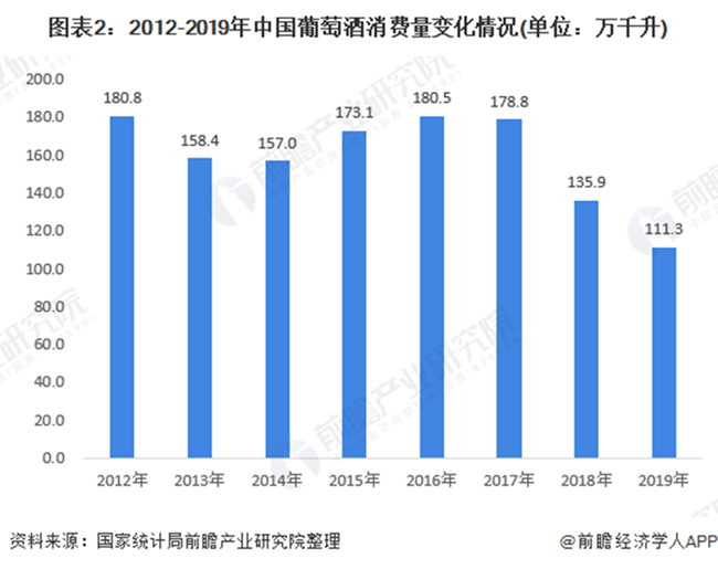 國家統(tǒng)計局?jǐn)?shù)據(jù)披露,2012-2019年,我國葡萄酒產(chǎn)量逐年下降。2019年,我國葡萄酒產(chǎn)量為4.51億升,較2018年下滑28.30%。2020年上半年,我國葡萄酒產(chǎn)量繼續(xù)走低,僅為1.27億升。