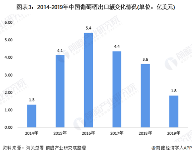 海關(guān)數(shù)據(jù)顯示,2019年,受行業(yè)景氣程度影響,我國葡萄酒進(jìn)出口額均有所下降,進(jìn)口額實(shí)現(xiàn)35.4億美元,出口額實(shí)現(xiàn)1.8億美元,進(jìn)口額跌幅高于出口額。整體進(jìn)出口總額降為37.2億美元,實(shí)現(xiàn)貿(mào)易逆差33.6億美元。