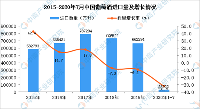 2020年1-7月中國葡萄酒進口量及金額增長情況