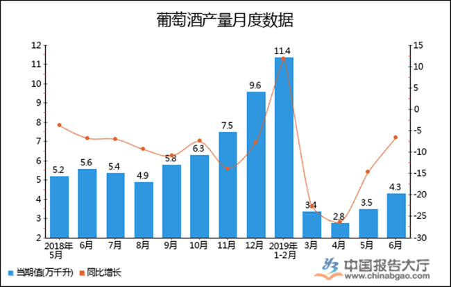 根據中國報告大廳對2019年1-6月全國葡萄酒產量進行監測統計顯示:2019年6月全國葡萄酒產量4.3萬千升,同比下降6.5%,2019年1-6月全國葡萄酒產量為24.5萬千升,累計下降19.9%。