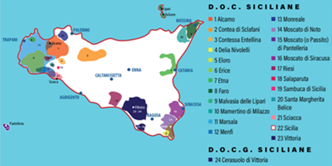西西里地處歐亞中東的十字路口,是地中海最大的島嶼。大自然的恩賜使這里十分適宜葡萄生長。島嶼整體呈典型的地中海氣候,但又因島內多樣性的地形,造就了各具特色的區域風格:內陸干燥而熾熱,海岸暖風習習,埃特納火山以及山丘地區濕潤而涼爽。因此,西西里成為了意大利最大的葡萄種植區,出產各式性格鮮明的葡萄酒。西西里因其戰略性的地理位置,在歷史上曾是兵家必爭之地。也成就了其悠久的釀酒歷史,最早可追溯至公元前8世紀。如今的西西里是意大利第一個追求有機種植的地區,尊重自然和可持續性發展。越來越多的釀酒師致力于打造新鮮而直接的美酒,選擇更為現代的風格,適應國際菜肴的搭配。近年來,西西里葡萄酒生產取得了突飛猛進的進步:2018年瓶裝產量約為8000萬瓶,較之2017年的3000萬瓶增長了167%。而2019全年的瓶裝產量預計會達到1億瓶。