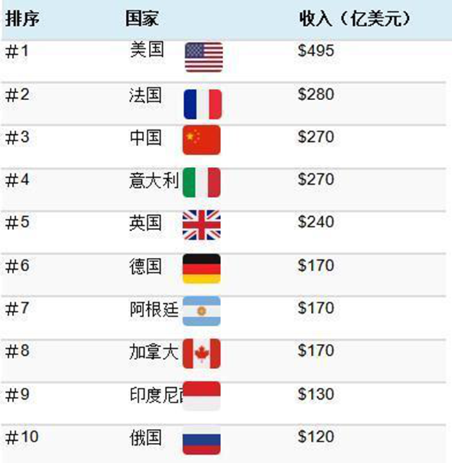 各個(gè)國(guó)家的葡萄酒銷售收入情況,單位是:10億美元。美國(guó)第一、中國(guó)第三。