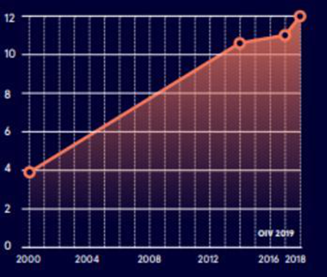 2000年至2018年的中國(guó)的紅酒葡萄種植園占世界的比重,如下圖所示,一直說在快速的增加過程中。