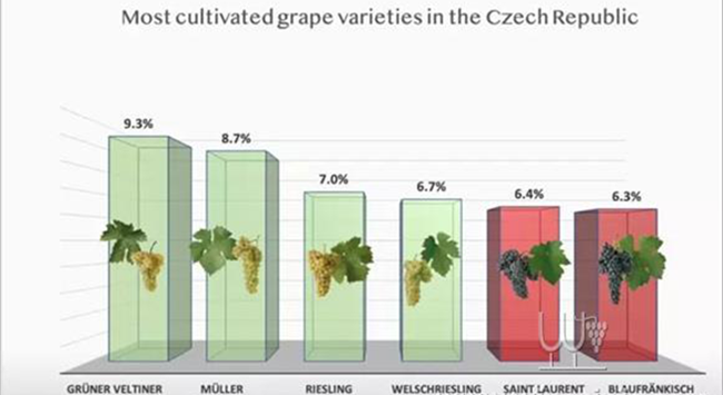 雖然捷克在種植面積上較小(約為17900公頃),卻種植了超過50多種葡萄品種,其中69%為白葡萄品種。而一些較新的葡萄藤則開始包括了諸如摩拉維亞麝香葡萄(Moravian Muscat)、帕拉瓦(Palava)、安得雷(Andre)等本土葡萄品種。