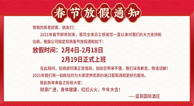 白駒過隙,又是一年春節到!惜別2020年,迎來了充滿希望、機遇和挑戰的2021年!正值中國的傳統節日“春節”來臨,在此藍菲酒業全體員工向大家拜個早年!恭祝大家新春快樂,財源廣進!